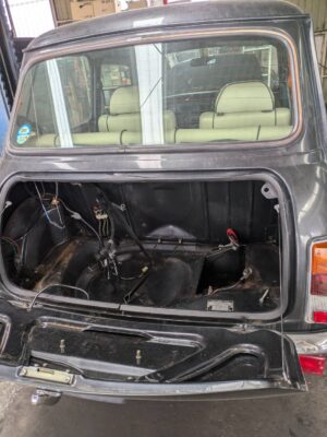 ローバーミニの燃料ポンプは**トランク内部(後方)**に配置されています。